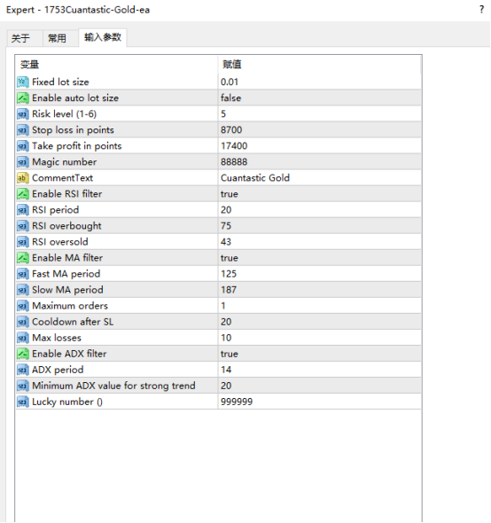 3、订单标识:通过魔术数字(MagicNumber=88888)和评论文本(CommentText=”Cuantastic Gold”)对订单进行唯一标识,方便交易者追踪和管理EA生成的交易。