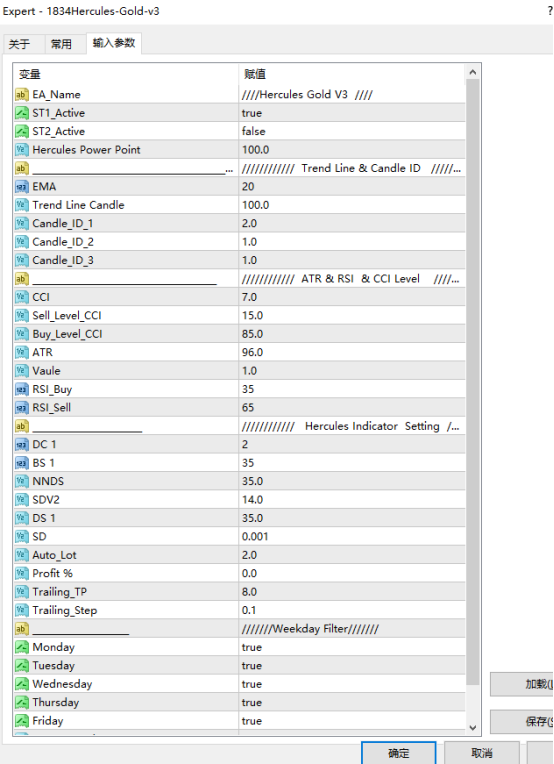 • 时间过滤:启用“Weekday filter”,默认周一至周五全时段交易(Monday至Friday均设为true);