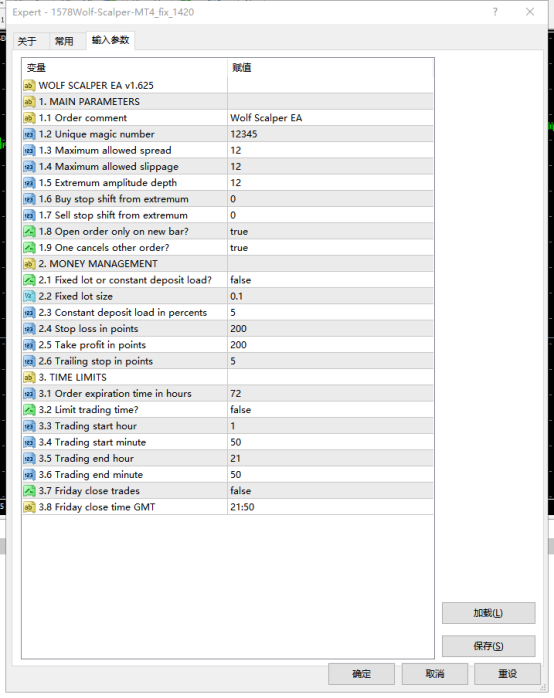 Dynamic autolot(动态手数):通过Constant deposit load in percents`按账户资金百分比计算手数(如设置5%,则每笔交易使用5%账户资金),适合追求仓位动态平衡的用户。