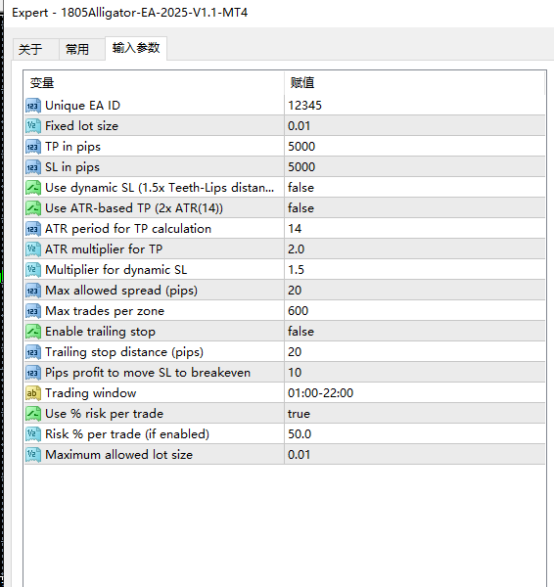 Alligator EA 2025支持全方位参数调整,交易者可根据自身风险偏好与交易风格,定制专属交易方案: