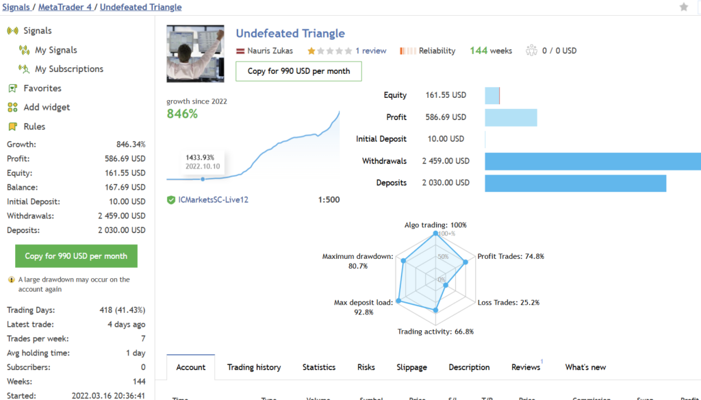 “Undefeated Triangle” 信号具有一定的盈利潜力,但也伴随着较高的风险。其网格 – 马丁格尔策略、有限的货币对选择以及近期不太稳定的表现是需要重点关注的方面。对于风险承受能力较高、对这些特定货币对有深入了解并愿意密切监控账户的交易者来说,它可能具有一定的吸引力。然而,在使用该信号之前,交易者应该充分了解其风险特征,并确保自己的账户能够承受可能的损失。同时,建议持续关注其后续的表现和稳定性。此外,网站显示的增长数据与实际用户体验之间的差异也需要进一步核实和关注。