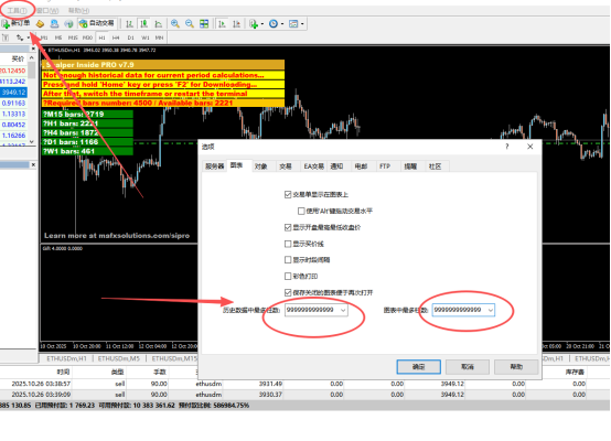 ②如面板显示无历史数据,请点击【工具】——【选项】——【图表】将柱数数量改到最大,缓存一会。