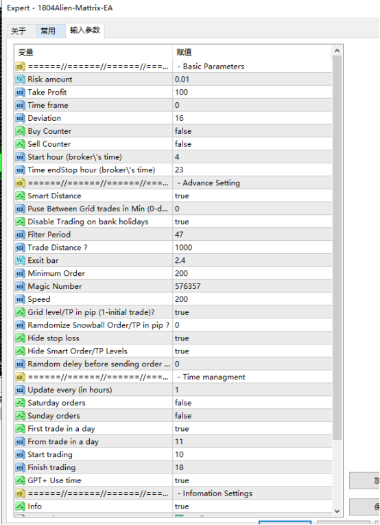 • 止损与止盈:Hide_stop_loss=true(隐藏止损,可能为了避免市场滑点操纵),Grid_TP_pips=true(网格止盈模式,按点数设置止盈),Snowball_TP_pips=0(禁用滚雪球式止盈)。
